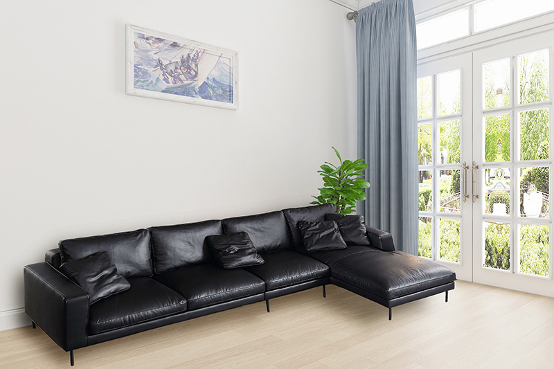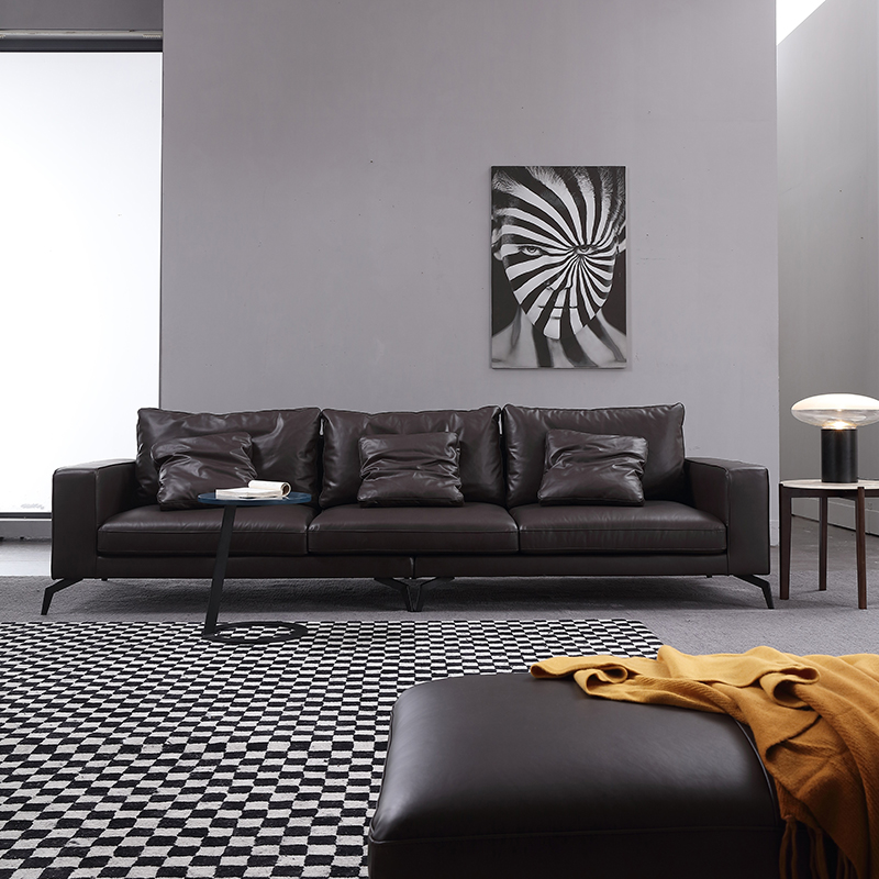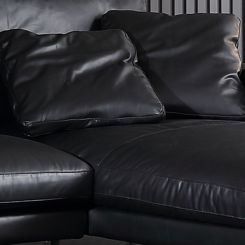 Som vi alle ved, er ægte lædersofaer meget holdbare. Til vores sorte ægte lædersofa anbefales det at matche lysfarvet baggrundsvæg som grå farve, og møbler som et hvidt marmor sofabord. Under skarp belysning frembringer den en stilfuld følelse af rum.