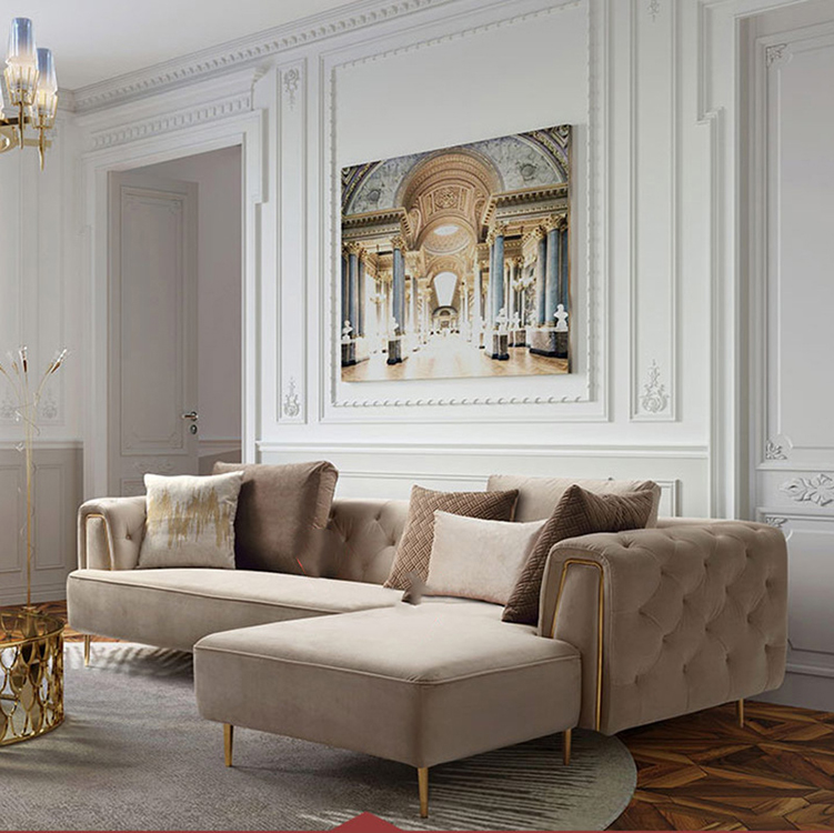#K03 Diseño de lujo azul oscuro con patas de acero dorado Sofá chesterfield de terciopelo con chaise longue
