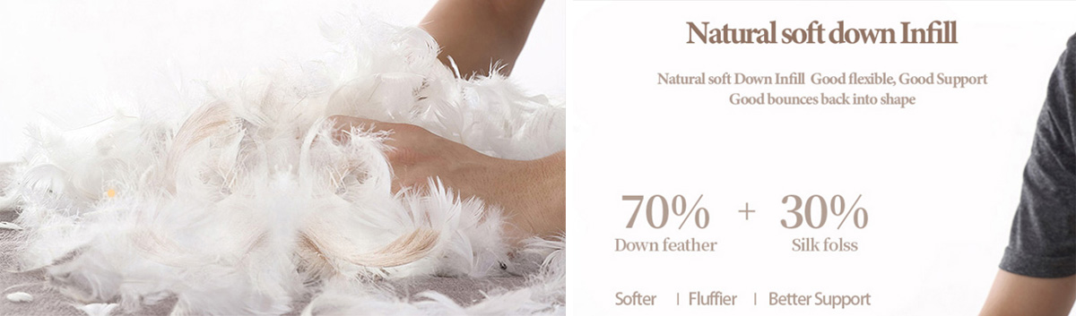 La morbida imbottitura in filato di seta misto piuma naturale mantiene la sua forma e dona al tuo corpo un morbido sostegno. Il rapporto di imbottitura è del 70% di piumino e del 30% di filo di seta per renderlo più morbido, più soffice e più confortevole. Il flessibile filo interdentale di seta riprende la forma sia che tu lo abbia avuto dietro la schiena o sotto la testa per un supporto extra.