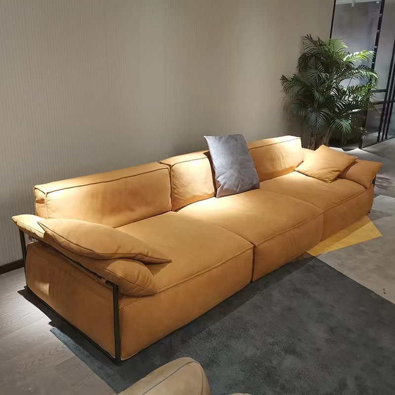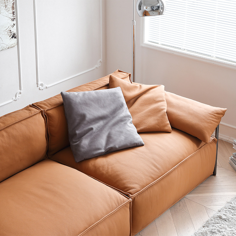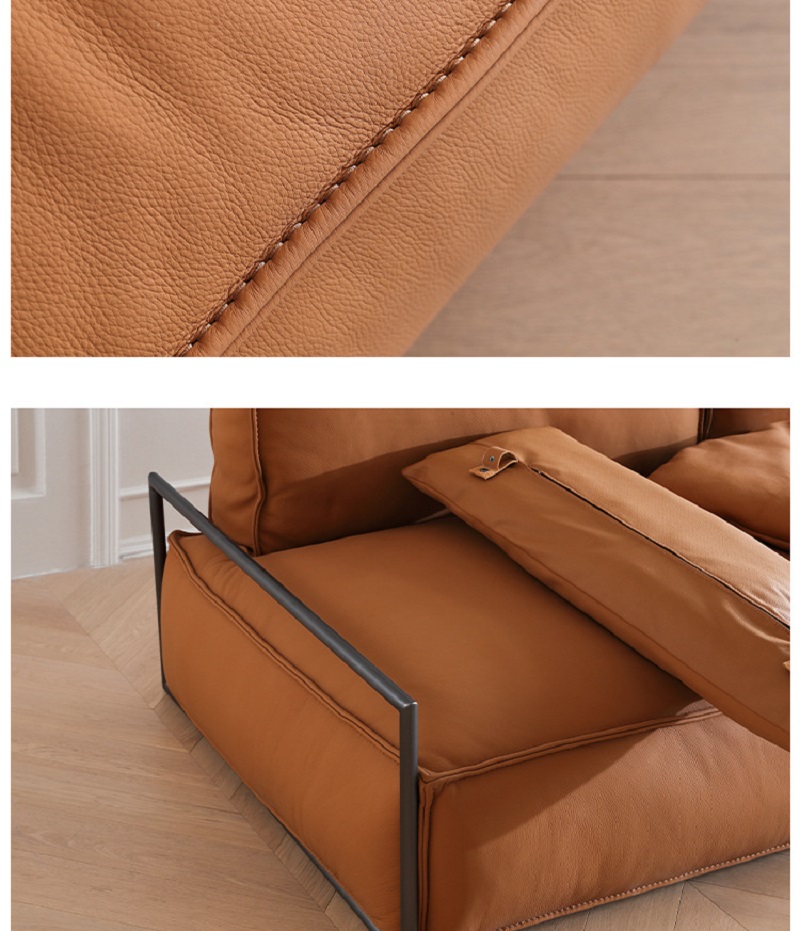この革製のソフトイーズソファはロシアから輸入したパイン無垢材で作られており、シートクッションには高密度の反発スポンジと羽毛が詰められており、軽いタッチ感を与えます。