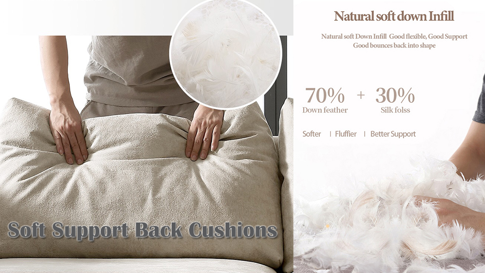 Apabila anda duduk di sofa, anda ingin berehat dan melabuhkan punggung sepenuhnya ke dalam pelukan sofa. Kusyen belakang yang lembut akan memberikan anda perasaan yang sangat selesa. Pengilang sofa Foshan Kabasa China mengkhususkan diri untuk membuat kusyen belakang yang paling selesa untuk sofa. Bahan isi kusyen belakang diperbuat daripada benang sutera campuran bulu bawah. Isian serunding sutera campuran bulu turun semula jadi yang lembut mengekalkan bentuknya dan memberikan sokongan lembut kepada badan anda. Nisbah isian ialah 70% bulu ke bawah dan 30% benang sutera untuk menjadikan lebih lembut, gebu dan lebih selesa. Benang sutera fleksibel melantun kembali ke bentuk sama ada anda mempunyainya di belakang atau di bawah kepala anda untuk sokongan tambahan.