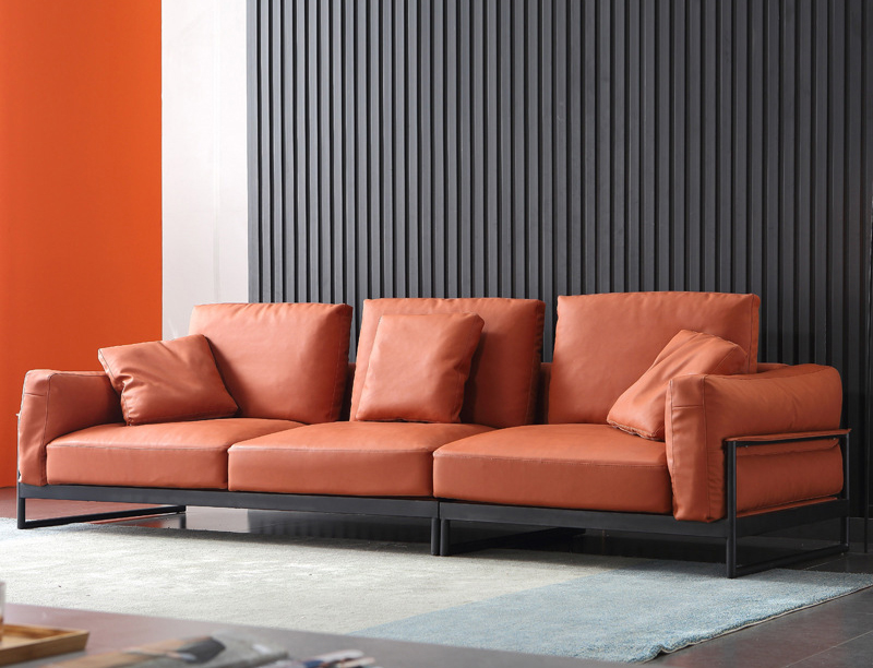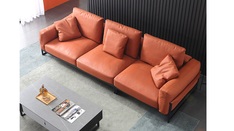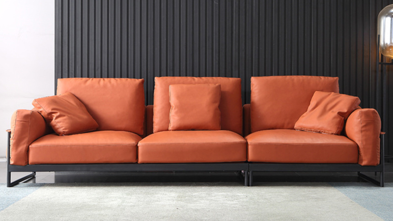 Sofa oren ini diperbuat daripada upholsteri kulit premium.