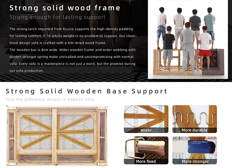 China Foshan Kabasa sofa factory focuses more details for the sofa inside. Our clean-lined design sofa is crafted with a kiln-dried wood frame. The strong larch imported from Russia supports the high-density padding for lasting comfort. 5-10 adults weight is no problem to support. Also you would find the different between kabasa and other normal sofa in the market.