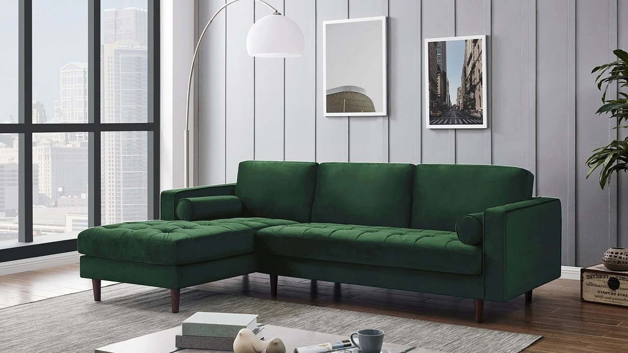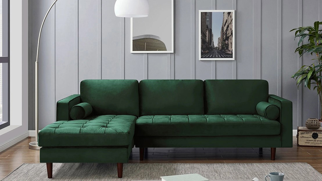 Green velvet sofa and couch l shape is complete your living room decor. The velvet matairl is comfortable living room furniture sets for touch and seating and lying down.