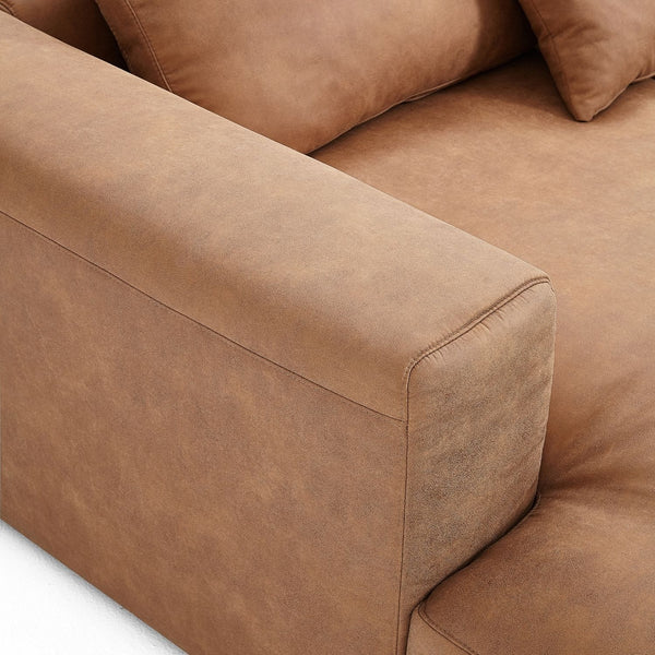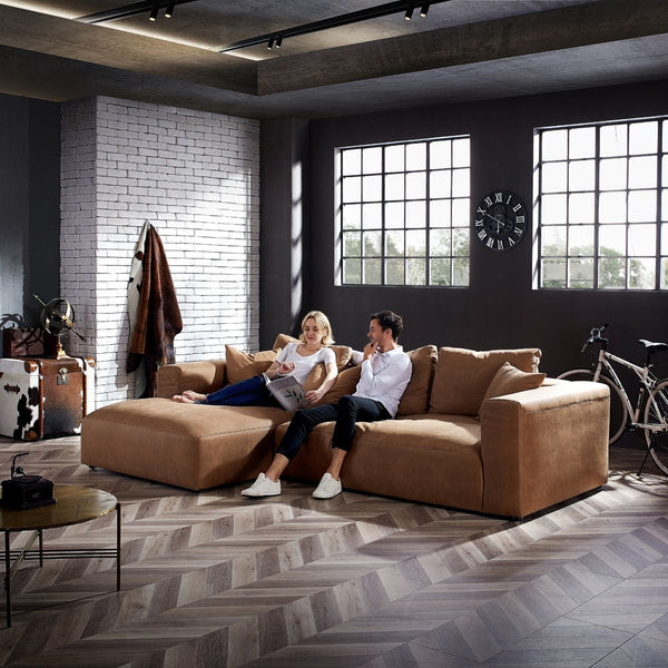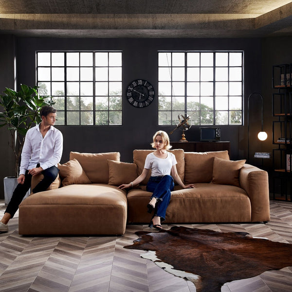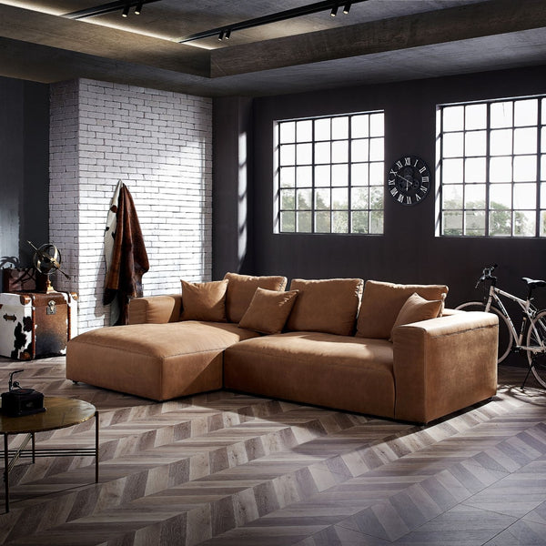 Three Seater Corner Sofa with an ottoman black powder coated metal legs and includes six cushions. The streamlined aesthetic juxtaposes with the soft down filled cushions, which makes for a very inviting sofa. A defining feature of L shaped corner sofa couch is its thick armrests offset by the solid wood frame, raising the elements off the ground, thus conveying a sense of lightness. The ottoman contributes to the versatility of the design and the product is available in other configurations and sizes, and also in other fabric, colour or leather.